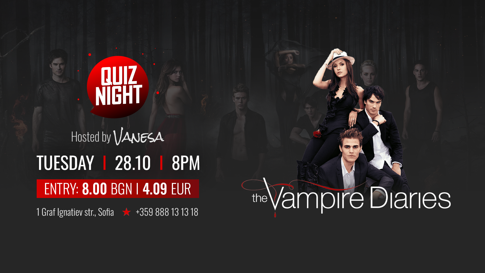 Тази вечер няма да преследваме вампири, а ще гоним точки. Съберете отбор от 2-6 души, извадете най-добрите си спомени от сериала и се пригответе за игра, в която Деймън е винаги чаровен, Стефан – леко драматичен, Елена пак не може да избере между двамата, а Катрин… тя винаги е виновна, но със стил.